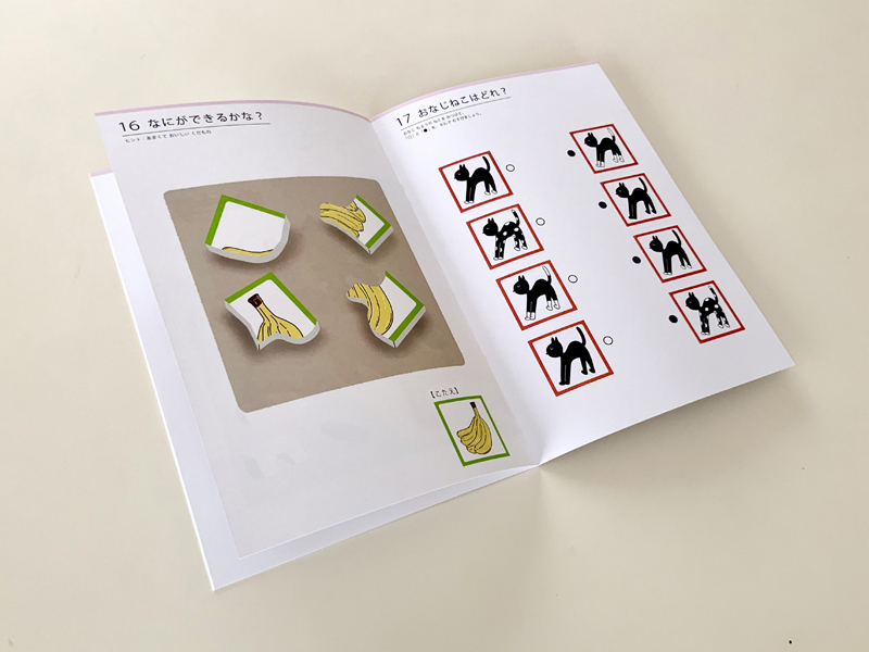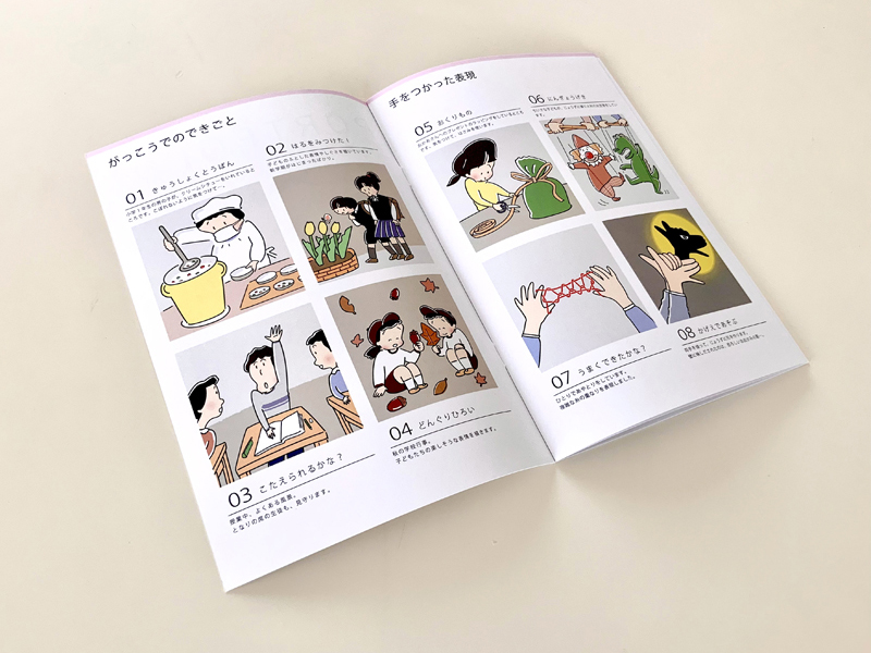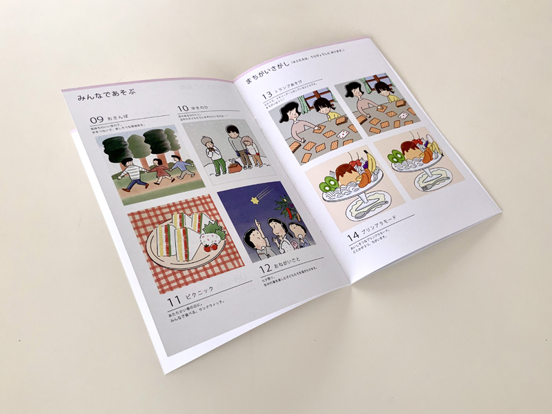 学校行事や季節を感じられるイラストなどが掲載されています。また、「まちがいさがし」「さがしもの絵本」「パズル」「絵あわせ」「めいろ」など、実際に楽しめる内容となっております。A5サイズ12P(表紙込み)。