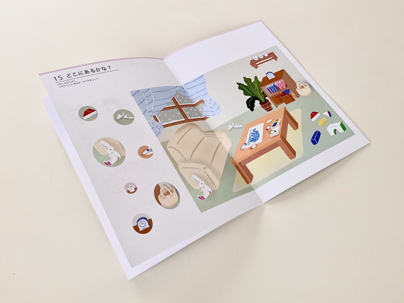 かばん、とけい、スリッパ、クレヨン、積み木、うさぎのぬいぐるみ……。部屋のどこにかくれているかさがしてあそびます。つくえの上には、いろんな色のクレヨンがあります。同じ色のクレヨンはどれでしょう?